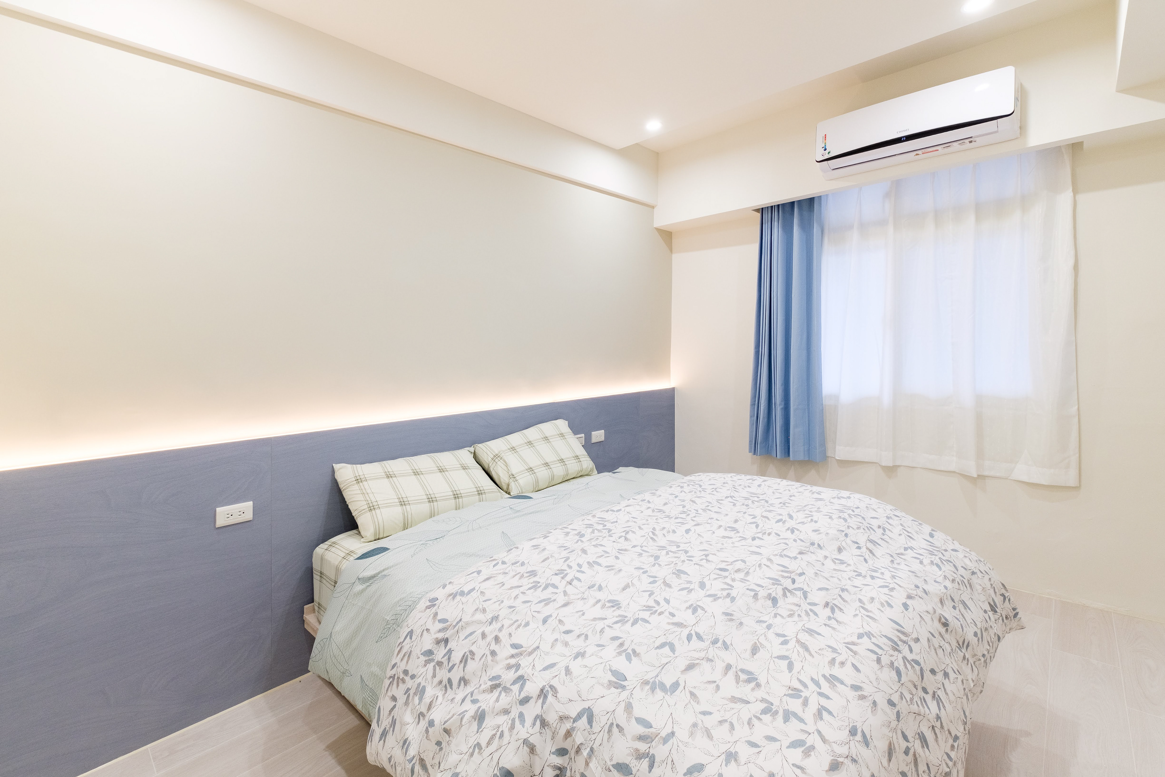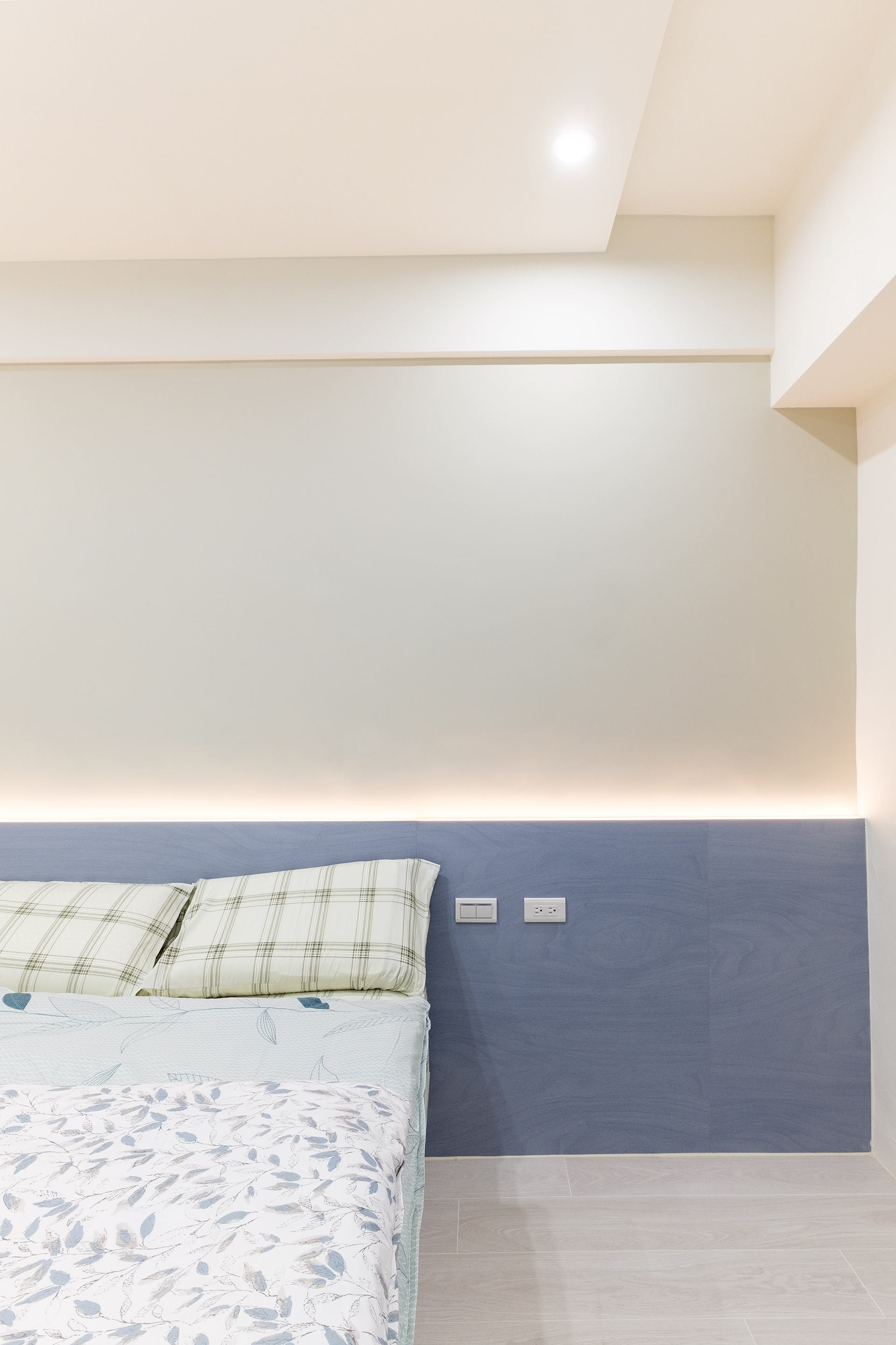 床頭延展一抹藍灰,與窗邊布簾相互呼應,營造如湖水般沉靜的氛圍。
